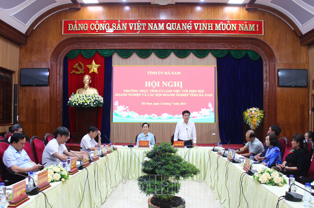 Đại diện Hiệp hội doanh nghiệp và các Hội doanh nghiệp tỉnh đã có một số ý kiến kiến nghị, đề xuất với Thường trực Tỉnh ủy như: Tham mưu, kiến nghị sửa đổi Luật Bảo hiểm xã hội cho phù hợp với nhóm người lao động thời vụ là nông dân không bắt buộc tham gia bảo hiểm xã hội; nghiên cứu sửa đổi các điều khoản bất cập của Luật Đầu tư; khuyến khích, ủng hộ phát triển các hộ kinh doanh, các doanh nghiệp siêu nhỏ về lãi suất, hỗ trợ thuế, phí, mặt bằng kinh doanh; đề nghị có văn bản hướng dẫn, đồng ý cho doanh nghiệp triển khai đầu tư điện mặt trời trên diện tích đất, mái nhà xưởng; xem xét bổ sung thêm các cụm công nghiệp gần vùng nguyên liệu xi măng, đá, gần cảng tại huyện Thanh Liêm cho các doanh nghiệp đầu tư, chế biến sâu; thực hiện điều chỉnh giá đất khởi điểm của các dự án đấu giá đất cho hợp lý, phù hợp với thị trường.