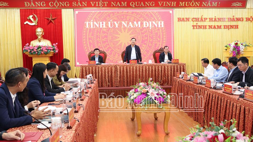 Phát biểu kết luận tại buổi làm việc, đồng chí Bí thư Tỉnh ủy Phạm Gia Túc khẳng định, năm 2023 Nam Định đã đạt được những thành tựu đột phá trong phát triển kinh tế - xã hội; trong đó triển khai thực hiện các dự án trọng điểm, đầu tư xây dựng cơ sở hạ tầng giao thông kết nối; tập trung cải cách hành chính, cải thiện môi trường đầu tư kinh doanh; triển khai công tác quy hoạch có tầm nhìn dài hạn, bảo đảm cho sự phát triển lâu dài theo định hướng phát triển xanh, bền vững. Hệ thống kết cấu hạ tầng kinh tế - xã hội, đặc biệt là hệ thống giao thông, hạ tầng các khu, cụm công nghiệp được tập trung đầu tư, tạo động lực cho phát triển kinh tế - xã hội. Công tác xúc tiến và thu hút đầu tư có trọng tâm, trọng điểm và đã có những kết quả đáng kể. Công tác cải cách hành chính, xây dựng chính quyền điện tử, chuyển đổi số tiếp tục đạt được kết quả tích cực. Tỉnh đẩy mạnh xúc tiến kêu gọi đầu tư ở tất cả các lĩnh vực, coi trọng việc nhà đầu tư đảm bảo các yếu tố công nghệ cao, bảo vệ môi trường, đóng góp lớn vào ngân sách Nhà nước, đảm bảo an sinh xã hội cho người lao động và tiến độ đầu tư dự án. Đồng chí Bí thư Tỉnh ủy hoan nghênh tập đoàn đã dành sự quan tâm, tìm hiểu môi trường đầu tư tại Nam Định và cam kết sẽ tạo điều kiện thuận lợi tối đa theo khuôn khổ pháp luật cho nhà đầu tư.