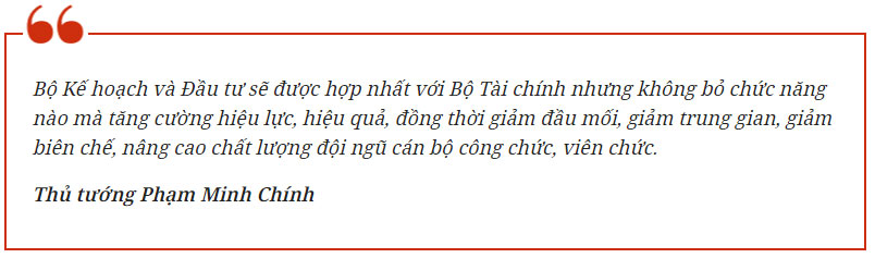 Thủ tướng nêu rõ, chúng ta đang tập trung cao độ công tác tổng kết Nghị quyết số 18-NQ/TW và đẩy mạnh sắp xếp tổ chức bộ máy "tinh-gọn-mạnh-hiệu năng-hiệu lực-hiệu quả". Bộ Kế hoạch và Đầu tư sẽ được hợp nhất với Bộ Tài chính nhưng không bỏ chức năng nào mà tăng cường hiệu lực, hiệu quả, đồng thời giảm đầu mối, giảm trung gian, giảm biên chế, nâng cao chất lượng đội ngũ cán bộ công chức, viên chức.