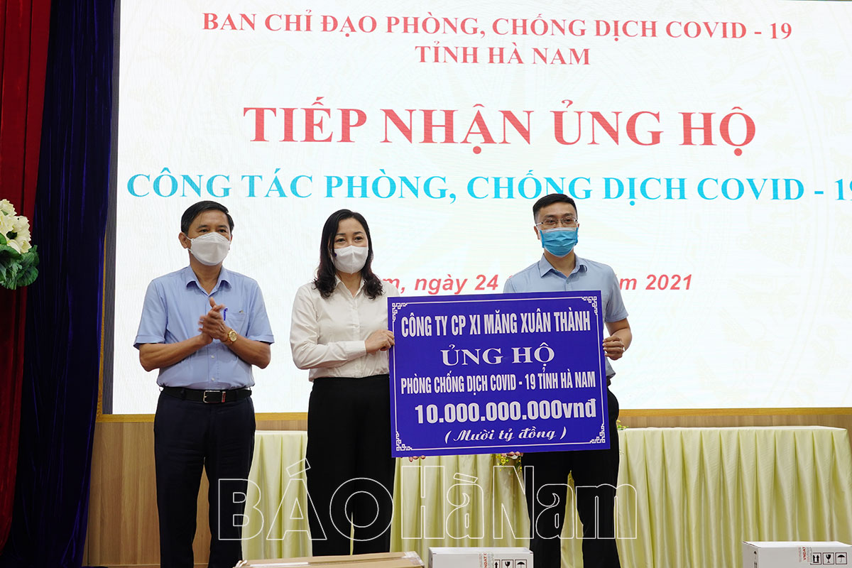 Tại lễ tiếp nhận, Doanh nghiệp xây dựng Xuân Trường ủng hộ kinh phí mua vắc- xin, trang thiết bị y tế phòng, chống dịch Covid-19 với tổng trị giá 50 tỷ đồng; Công ty cổ phần Tập đoàn BRG SeaBank tài trợ máy xét nghiệm Covid – 19 với tổng giá trị 6 tỷ đồng; Công ty Cổ phần xi măng Xuân Thành ủng hộ kinh phí phòng, chống dịch Covid - 19 với số tiền 10 tỷ đồng; Công ty TNHH YJ Hà Nam - Thanh Liêm ủng hộ 500 triệu đồng; Công ty TNHH YJ Hà Nam - Lý Nhân ủng hộ 300 triệu đồng, công ty TNHH JK Việt Nam ủng hộ 100 triệu đồng.