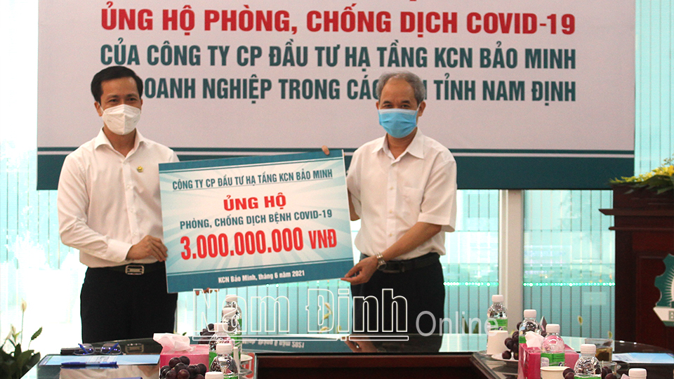 Hưởng ứng thư kêu gọi Ủy ban MTTQ tỉnh, thời gian qua, Công ty Cổ phần Đầu tư hạ tầng KCN Bảo Minh và Ban quản lý các KCN tỉnh đã kêu gọi cộng đồng các doanh nghiệp sản xuất trong KCN Bảo Minh và trong các KCN của tỉnh chung tay đóng góp, ủng hộ phòng, chống dịch COVID-19. MTTQ tỉnh đã tổ chức tiếp nhận kinh phí ủng hộ của các doanh nghiệp với tổng số tiền trên 7 tỷ đồng. Trong đó, Công ty Cổ phần Đầu tư hạ tầng KCN Bảo Minh và các doanh nghiệp trong KCN Bảo Minh đóng góp 5 tỷ 258 triệu đồng. Tiêu biểu là Công ty Cổ phần Đầu tư hạ tầng KCN Bảo Minh đóng góp 3 tỷ đồng; Công ty Cổ phần Dệt Bảo Minh 500 triệu đồng; Tập đoàn Sunrise 30 nghìn USD; Công ty TNHH Công nghiệp Ramatex Nam Định 15 nghìn USD; Công ty TNHH Sợi dệt nhuộm Yulun Việt Nam 180 triệu đồng; Công ty TNHH Great Market Global Việt Nam 10 nghìn USD… Các doanh nghiệp trong KCN Hòa Xá, KCN Rạng Đông ủng hộ trên 2 tỷ đồng. Trong đó, cán bộ, công chức, viên chức Ban quản lý các KCN tỉnh 20 triệu đồng; Công ty TNHH May Việt Thuận 500 triệu đồng; Công ty TNHH Youngone Nam Định 20 nghìn USD; Tập đoàn TORAY 15 nghìn USD; Công ty TNHH Universal Candle Việt Nam 250 triệu đồng; Công ty Cổ phần TCE Vina Denim 100 triệu đồng; Công ty TNHH Mai Văn Đáng 70 triệu đồng.