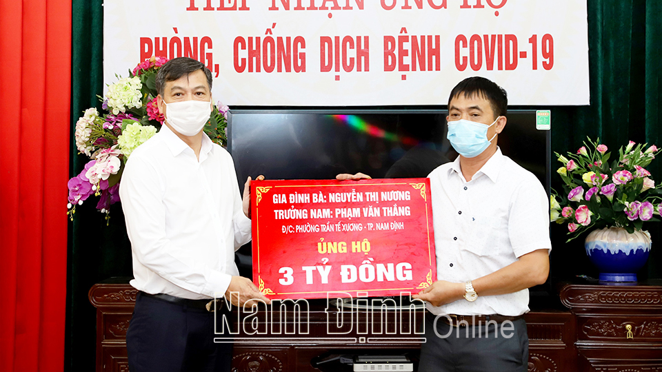 Trong buổi sáng 7-8, UBND tỉnh đã tiếp nhận ủng hộ của Công ty Cổ phần Đầu tư dịch vụ và thương mại ATP (Hà Nội) gồm 6 máy thở nhãn hiệu Eliciae MV20 và các trang thiết bị kèm theo với tổng trị giá khoảng 60 nghìn USD; đại diện gia đình bà Nguyễn Thị Nương, phường Trần Tế Xương (thành phố Nam Định) ủng hộ 3 tỷ đồng, trong đó đóng góp vào Quỹ phòng, chống dịch bệnh COVID-19 của tỉnh 2 tỷ đồng; Quỹ phòng, chống dịch bệnh COVID-19 huyện Vụ Bản 500 triệu đồng và Quỹ phòng, chống dịch bệnh COVID-19 của Công an tỉnh Nam Định 500 triệu đồng.