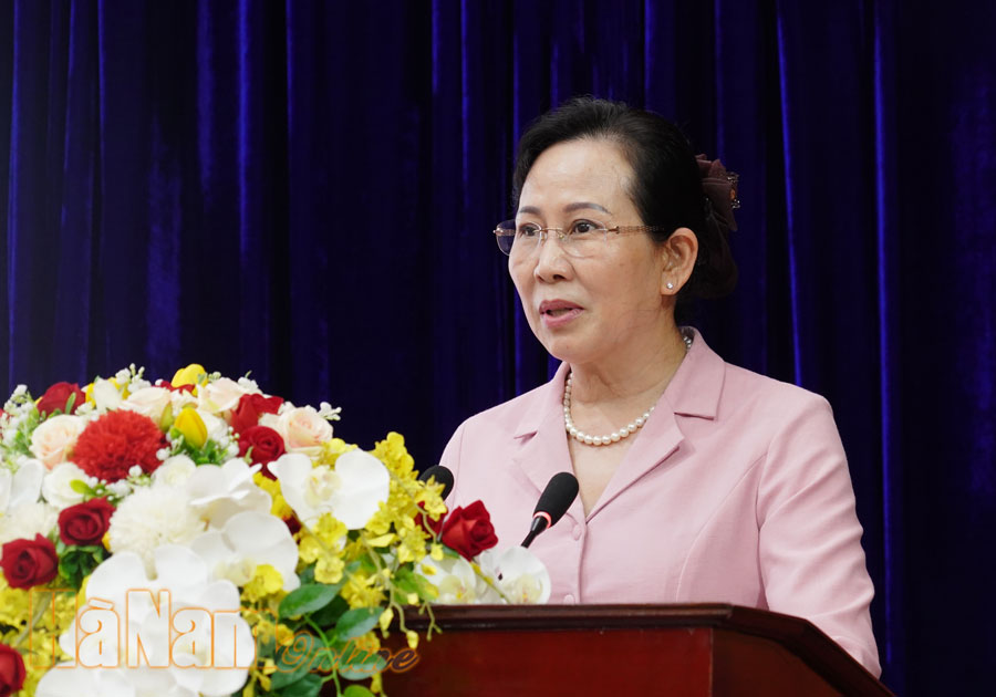 Đồng chí Lê Thị Thủy, Ủy viên Trung ương Đảng, Bí thư Tỉnh ủy, Trưởng đoàn ĐBQH tỉnh khóa XIV, Chủ tịch HĐND tỉnh phát biểu cảm ơn sự ủng hộ của Hội Cán bộ cơ quan trung ương tướng lĩnh và doanh nhân quê Hà Nam đối với công tác phòng, chống dịch Covid-19 của địa phương