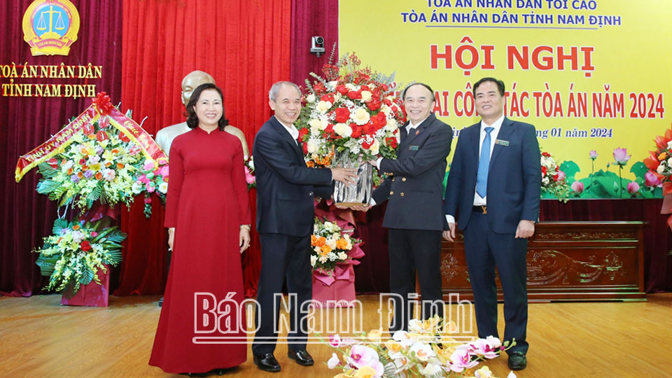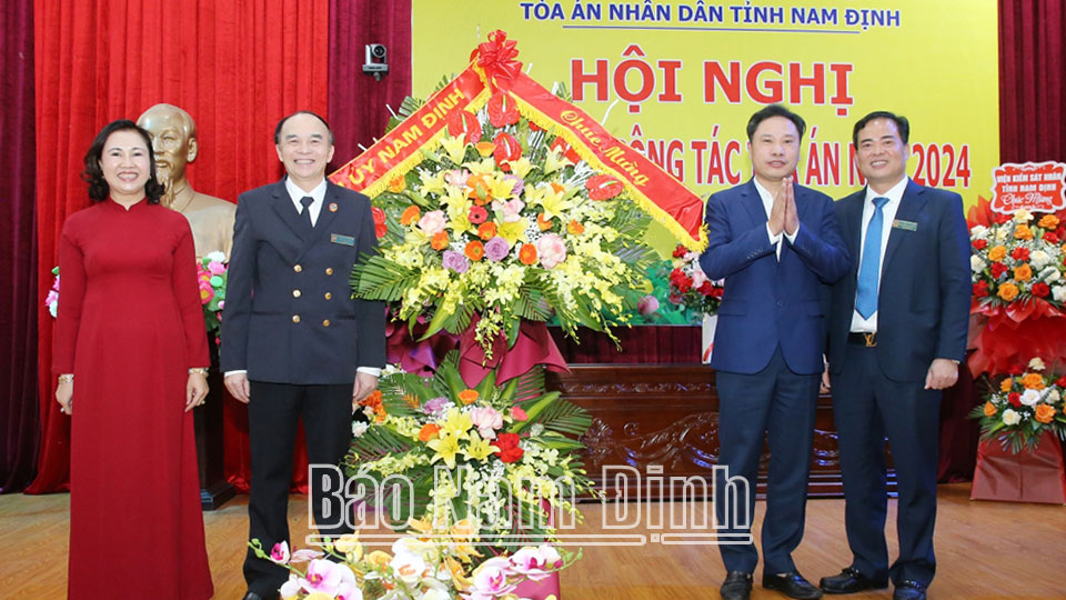| Đồng chí Hoàng Nguyên Dự, Ủy viên Ban TVTU, Trưởng Ban Nội chính Tỉnh ủy tặng lẵng hoa của Tỉnh ủy Nam Định chúc mừng ngành TAND tỉnh. |