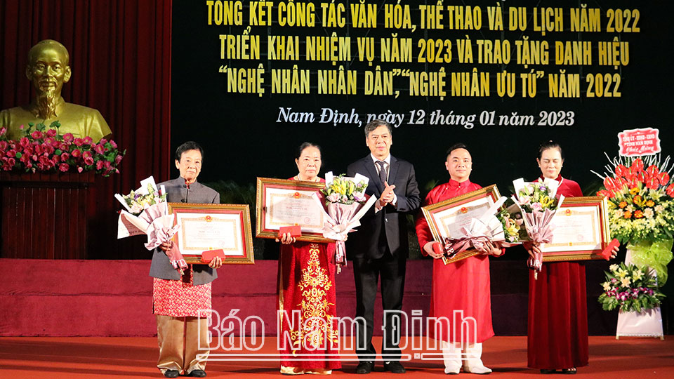 Chiều 12-1, Sở Văn hóa, Thể thao và Du lịch (VH, TT và DL) tổ chức hội nghị tổng kết công tác năm 2022, triển khai nhiệm vụ trọng tâm năm 2023; trao tặng danh hiệu Nghệ nhân Nhân dân (NNND), Nghệ nhân Ưu tú (NNƯT) lĩnh vực di sản văn hoá phi vật thể lần thứ 3 năm 2022. Đồng chí Trần Lê Đoài, TUV, Phó Chủ tịch UBND tỉnh; lãnh đạo một số sở, ban, ngành, các huyện, thành phố trong tỉnh đến dự.