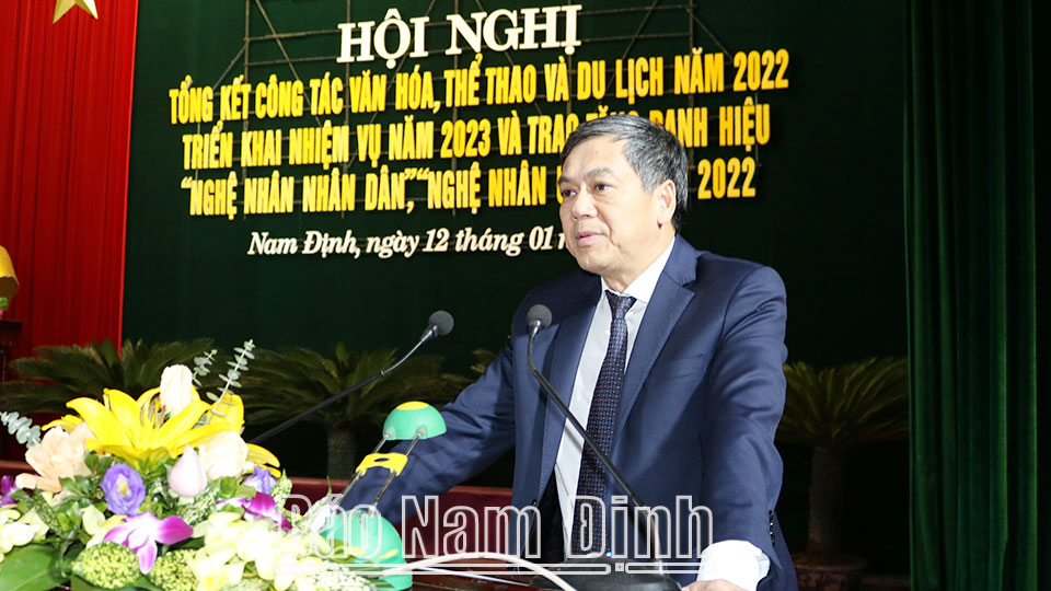 Phát biểu tại hội nghị, đồng chí Phó Chủ tịch UBND tỉnh Trần Lê Đoài ghi nhận, đánh giá cao kết quả đã đạt được của ngành VH, TT và DL năm 2022 trong điều kiện tình hình dịch bệnh diễn biến phức tạp; đồng thời đề nghị “Năm 2023, ngành VH, TT và DL tiếp tục quán triệt, nâng cao nhận thức, tổ chức thực hiện hiệu quả mục tiêu, nhiệm vụ triển khai Kết luận của đồng chí Tổng Bí thư Nguyễn Phú Trọng tại Hội nghị Văn hóa toàn quốc năm 2021 và Kế hoạch thực hiện “Chiến lược phát triển văn hóa đến năm 2030”; Kết luận số 75-KL/TU của BCH Đảng bộ tỉnh về “Tiếp tục thực hiện Nghị quyết số 07 xây dựng môi trường văn hóa lành mạnh, góp phần thúc đẩy phát triển kinh tế - xã hội tỉnh”; Kế hoạch triển khai chương trình “Bảo tồn và phát huy bền vững giá trị di sản văn hóa Việt Nam giai đoạn 2021-2025”; chương trình “Số hóa di sản văn hóa Việt Nam giai đoạn 2021-2030”. Tổ chức sôi nổi các hoạt động văn hoá, văn nghệ, trang trí, khánh tiết nhân dịp mừng Đảng - mừng Xuân Quý Mão 2023; nhân Kỷ niệm 60 năm Ngày Bác Hồ về thăm Đảng bộ và nhân dân Nam Định, các ngày lễ, sự kiện chính trị quan trọng trong năm. Đẩy mạnh các hoạt động xúc tiến, kết nối, phát triển du lịch địa phương; đảm bảo an toàn dịch bệnh trong tổ chức các lễ hội truyền thống. Tập trung xây dựng đề án phát triển TDTT Nam Định, trong đó xác định các môn thể thao trọng điểm, thế mạnh của tỉnh để đẩy mạnh công tác tuyển chọn, đào tạo, huấn luyện VĐV thi đấu đạt thành tích cao tại các giải thể thao quốc gia, khu vực và quốc tế.