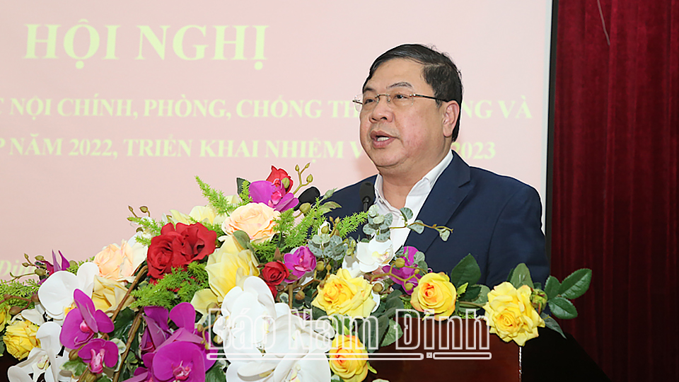 Chiều 6-1, Ban Thường vụ Tỉnh ủy tổ chức hội nghị tổng kết công tác nội chính, phòng, chống tham nhũng và cải cách tư pháp năm 2022, triển khai nhiệm vụ công tác năm 2023. Đồng chí Phạm Gia Túc, Ủy viên BCH Trung ương Đảng, Bí thư Tỉnh ủy, Trưởng Ban Chỉ đạo phòng, chống tham nhũng, tiêu cực tỉnh dự và chỉ đạo hội nghị. Tham dự hội nghị có các đồng chí Ủy viên Ban TVTU: Trần Anh Dũng, Phó Chủ tịch Thường trực UBND tỉnh; Nguyễn Văn Va, Trưởng Ban Tổ chức Tỉnh ủy; Nguyễn Mạnh Hiền, Chủ nhiệm Ủy ban Kiểm tra Tỉnh ủy; Hoàng Nguyên Dự, Trưởng Ban Nội chính Tỉnh ủy; Phạm Thị Thu Hằng, Trưởng Ban Tuyên giáo Tỉnh ủy; Đoàn Văn Hùng, Chủ tịch Ủy ban MTTQ tỉnh; Đại tá Trần Minh Tiến, Giám đốc Công an tỉnh; Nguyễn Anh Tuấn, Bí thư Thành ủy Nam Định; lãnh đạo các ngành trong Khối Nội chính; bí thư các huyện ủy, thành ủy, đảng ủy trực thuộc tỉnh.