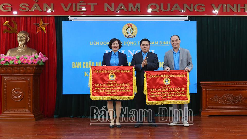 | Chủ tịch LĐLĐ tỉnh tặng Cờ của LĐLĐ tỉnh cho các đơn vị có thành tích xuất sắc trong phong trào thi đua lao động giỏi và xây dựng tổ chức công đoàn vững mạnh năm 2023. |
