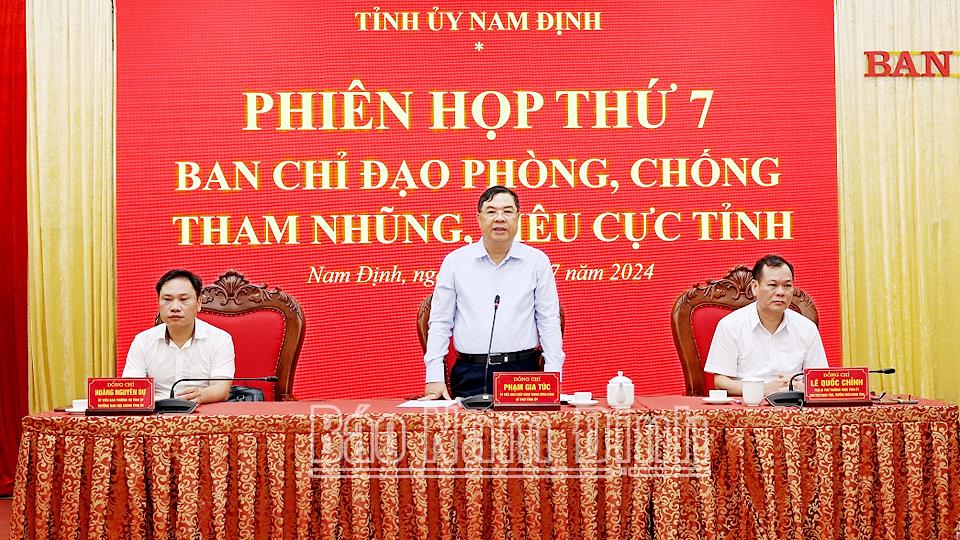 Phát biểu kết luận cuộc họp, đồng chí Bí thư Tỉnh ủy, Trưởng Ban Chỉ đạo Phạm Gia Túc ghi nhận, đánh giá cao kết quả đạt được trong thực hiện công tác phòng, chống tham nhũng, tiêu cực thời gian qua. Về nhiệm vụ trọng tâm thời gian tới, đồng chí Bí thư Tỉnh ủy, Trưởng Ban Chỉ đạo yêu cầu các cấp ủy, tổ chức đảng, Ban Chỉ đạo, các đồng chí thành viên Ban Chỉ đạo tiếp tục lãnh đạo, chỉ đạo triển khai, thực hiện kịp thời các chủ trương, giải pháp về phòng, chống tham nhũng, tiêu cực theo chỉ đạo của Trung ương, của tỉnh. Tiếp tục lãnh đạo, chỉ đạo phổ biến, tuyên truyền, triển khai thực hiện các văn bản chỉ đạo của Trung ương, của tỉnh về phòng, chống tham nhũng, tiêu cực, trong đó tập trung tuyên truyền các quy định về phòng, chống tham nhũng, tiêu cực trong công tác cán bộ, các kết luận của đồng chí Tổng Bí thư, Trưởng Ban Chỉ đạo Trung ương. Đẩy mạnh, phát huy hiệu quả các phương thức tuyên truyền phòng, chống tham nhũng, tiêu cực trên báo chí, internet, mạng xã hội... Tập trung lãnh đạo, chỉ đạo, đẩy mạnh tuyên truyền, vận động, đồng thời có những giải pháp quyết liệt trong công tác giải phóng mặt bằng, phối hợp với nhà đầu tư để sớm triển khai các dự án của Tập đoàn Xuân Thiện tại khu vực Cồn Xanh (Nghĩa Hưng).