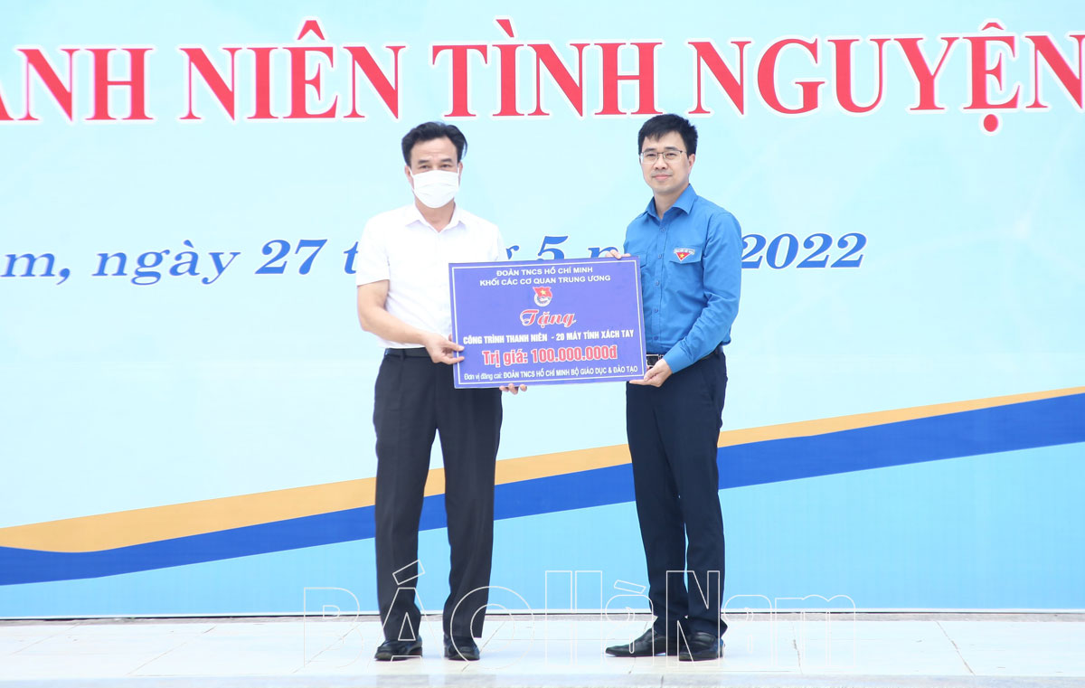 Nhân dịp này, BTV Tỉnh đoàn phối hợp với Đoàn khối các cơ quan Trung ương trao tặng 4 suất học bổng cho học sinh nghèo vượt khó trên địa bàn tỉnh; tặng 21 suất quà cho học sinh có hoàn cảnh khó khăn của Trường THPT A Phủ Lý và 20 máy tính xách tay cho Trường THCS Trần Phú (thành phố Phủ Lý). Tổng trị giá quà tặng tại chương trình là trên 300 triệu đồng.