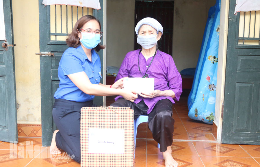 Lãnh đạo Tỉnh đoàn Hà Nam trao quà cho cụ bà Trần Thị Khuyên, hội viên Chi hội người cao tuổi thôn Tràng, xã Trịnh Xá, ,TP. Phủ Lý