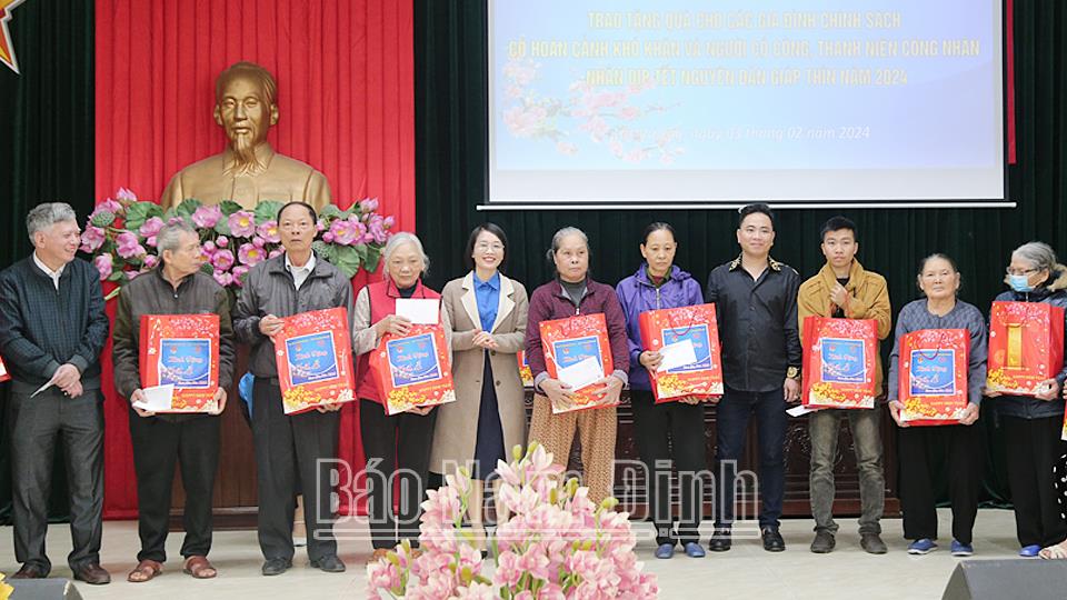 Nhân dịp đón Tết Nguyên đán Giáp Thìn 2024, ngày 3-2, Ban Thường vụ Tỉnh Đoàn phối hợp với Công ty TNHH Hoàng Tùng Dũng tổ chức chương trình trao tặng quà cho các gia đình chính sách, người có công, thanh niên công nhân có hoàn cảnh khó khăn tại xã Nam Mỹ (Nam Trực) và thành phố Nam Định. Dự chương trình có đồng chí Trần Minh Thắng, Ủy viên Ban TVTU, Trưởng Ban Dân vận Tỉnh ủy.