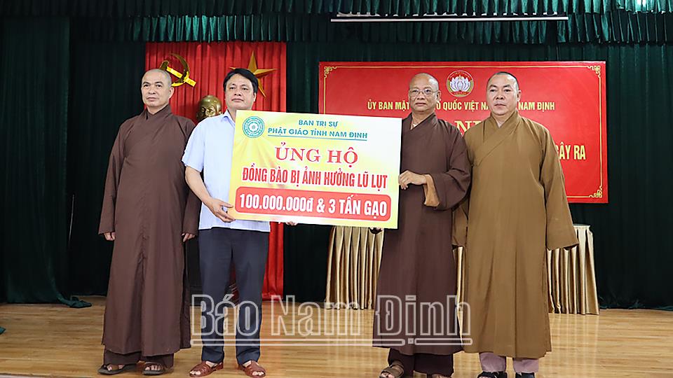 | Đồng chí Trần Minh Thắng, Ủy viên Ban TVTU, Chủ tịch Ủy ban Mặt trận Tổ quốc tỉnh tiếp nhận ủng hộ của Ban Trị sự Giáo hội Phật giáo tỉnh cho đồng bào bị ảnh hưởng bởi lụt bão. |
