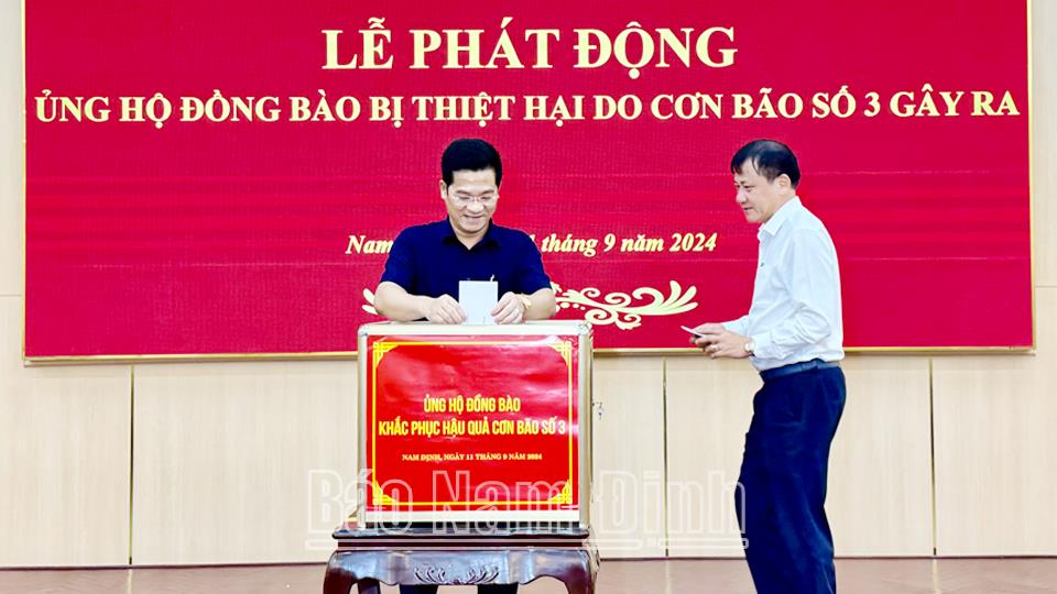 | Các đồng chí: Trần Anh Dũng, Ủy viên Ban TVTU, Phó Chủ tịch Thường trực UBND tỉnh; Mai Thanh Long, TUV, Phó Chủ tịch HĐND tỉnh ủng hộ tại Lễ phát động. |