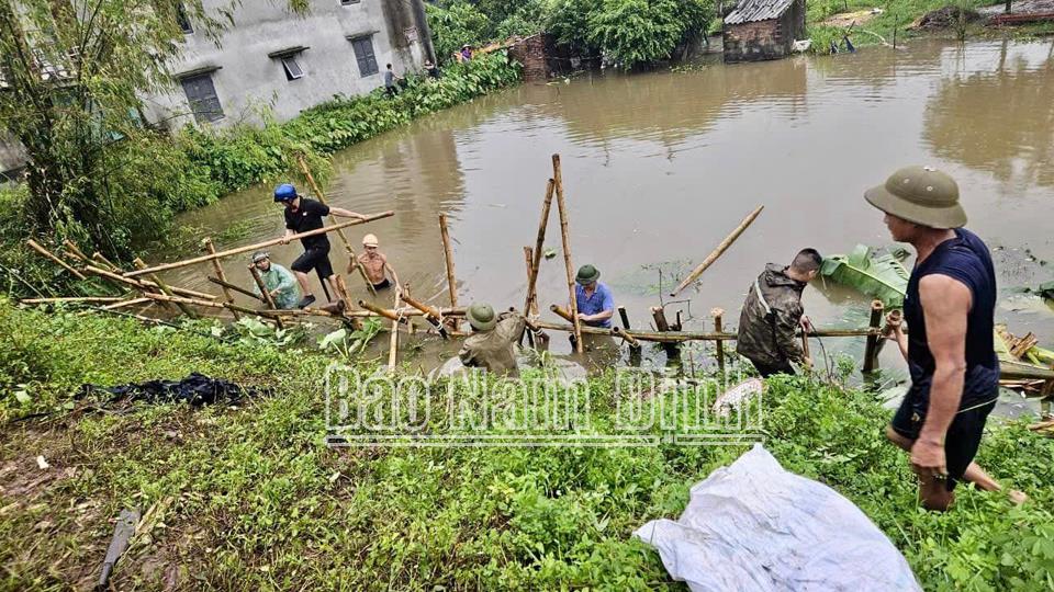 | Các lực lượng chức năng và người dân huyện Ý Yên toàn lực tập trung gia cố những đoạn đê xung yếu. |