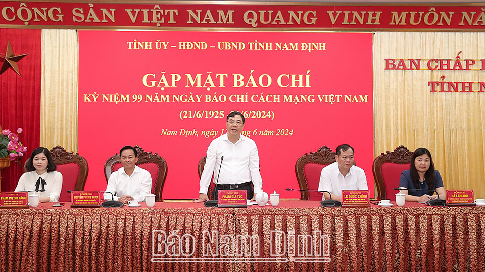 Nhân Ngày Báo chí Cách mạng Việt Nam, thay mặt lãnh đạo tỉnh, đồng chí Bí thư Tỉnh ủy Phạm Gia Túc gửi lời chúc mừng tốt đẹp nhất tới đội ngũ cán bộ, phóng viên các cơ quan báo chí Trung ương thường trú trên địa bàn. Đồng thời đề nghị, các cơ quan thông tấn, báo chí, các nhà báo, phóng viên tiếp tục quan tâm đồng hành cùng tỉnh, tập trung tuyên truyền về truyền thống văn hóa lịch sử, cách mạng hào hùng của Đảng bộ, chính quyền và nhân dân tỉnh Nam Định; tiềm năng, thế mạnh và khát vọng vươn lên của tỉnh trong các hoạt động sản xuất, kinh doanh, phát triển kinh tế - xã hội, xây dựng nông thôn mới nâng cao, kiểu mẫu để xây dựng tỉnh trở thành tỉnh khá của cả nước vào năm 2030.