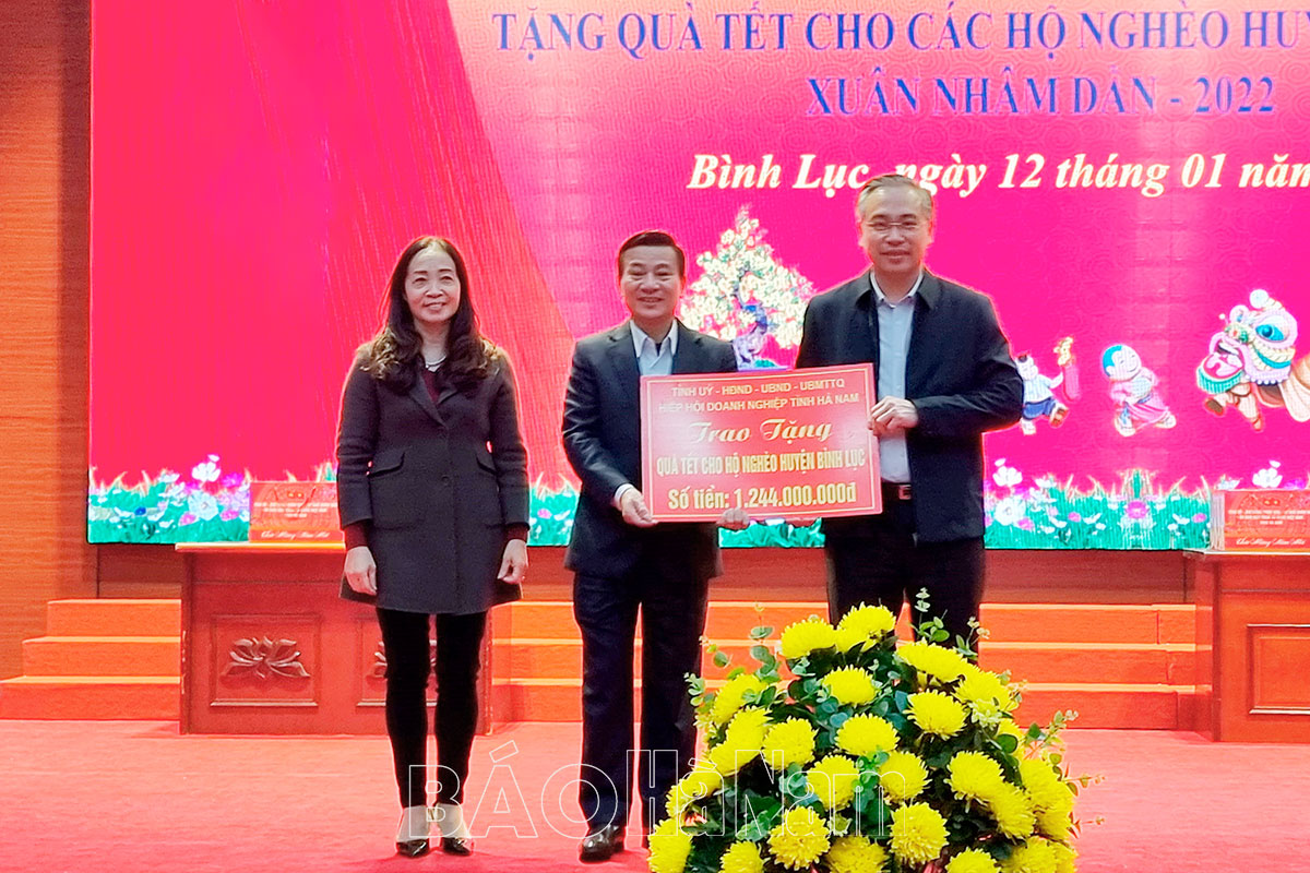 Tại hội nghị, thay mặt Tỉnh ủy, HĐND, UBND, Ủy ban MTTQ, Hiệp hội Doanh nghiệp tỉnh, đồng chí Đặng Thanh Sơn đã trao biển tượng trưng số tiền 1.244.000.000 cho 2.488 hộ nghèo (theo chuẩn nghèo đa chiều giai đoạn 2022-2025) và 9.260kg gạo cho 926 hộ nghèo (theo chuẩn nghèo đa chiều giai đoạn 2016-2020) của huyện Bình Lục. Tại đây, Đoàn đại biểu Quốc hội khóa XV cũng tặng 10 suất quà cho các hộ nghèo của huyện. Công ty TNHH Hà Phương ủng hộ huyện Bình Lục 200 triệu đồng để chăm lo cho người nghèo nhân dịp Tết Nhâm Dần 2022.