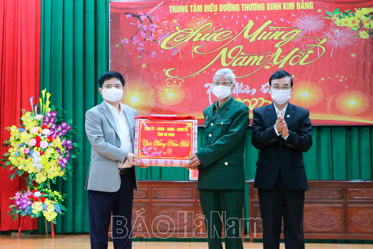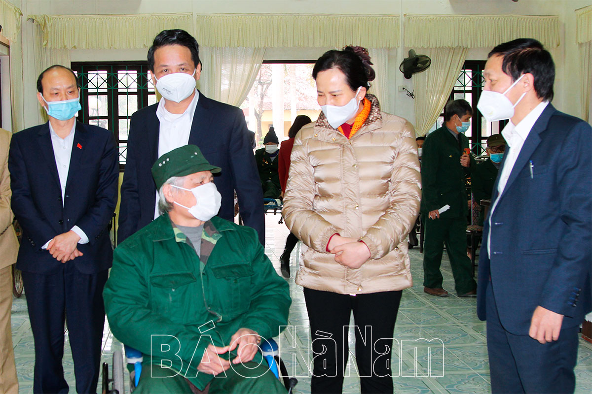 Cũng trong chiều 12/1, đồng chí Bí thư Tỉnh ủy cùng các đồng chí lãnh đạo tỉnh, thị xã, Đảng ủy Khối Doanh Nghiệp tỉnh đã tới thăm Trung tâm Điều dưỡng Thương binh Duy Tiên. Tại đây, đồng chí Bí thư Tỉnh ủy cùng các thành viên trong đoàn bày tỏ lòng biết ơn sâu sắc trước những cống hiến hy sinh của các thương bệnh binh cho Tổ quốc. Thông báo khái quát kết quả phát triển KT-XH tỉnh năm 2021, đồng chí Bí thư Tỉnh ủy Lê Thị Thủy khẳng định trong sự phát triển chung của tỉnh nhà có sự đóng góp không nhỏ của các thương, bệnh binh, gia đình người có công. Những năm qua, cấp ủy, chính quyền các cấp luôn quan tâm, chăm lo thực hiện chính sách hậu phương quân đội, coi đây là nhiệm vụ quan trọng. Đồng chí mong muốn thời gian tới các thương bệnh binh giữ gìn sức khỏe, tiếp tục phát huy phẩm chất “Bộ đội Cụ Hồ”, tham mưu, cống hiến, vận động người thân và nhân dân tích cực tham gia xây dựng quê hương. Đồng chí Bí thư Tỉnh ủy cũng ghi nhận và thể hiện lòng biết ơn chân thành trước sự chăm sóc tận tình, chu đáo của cán bộ, nhân viên đang công tác tại trung tâm, đồng thời mong muốn cán bộ, nhân viên đơn vị tiếp tục phát huy truyền thống đơn vị, thay mặt Đảng, Nhà nước, cấp ủy, chính quyền địa phương chăm sóc thương, bệnh binh ân cần, chu đáo, thực hiện hiệu quả công tác phòng chống dịch Covid-19.