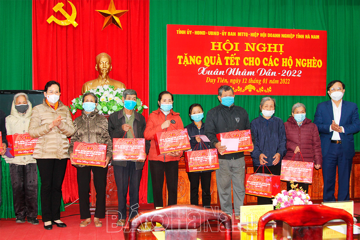 Thay mặt Tỉnh ủy, HĐND, UBND, Ủy ban MTTQ tỉnh, đồng chí Bí thư Tỉnh ủy đã trao biển tượng trưng số tiền quà tặng hộ nghèo cho lãnh đạo thị xã Duy Tiên, trao quà cho 10 hộ đại diện các hộ nghèo trên địa bàn thị xã. Đồng thời, đề nghị lãnh đạo địa phương chỉ đạo triển khai kế hoạch, tổ chức trao tặng quà cho hộ nghèo kịp thời, đúng đối tượng. Cùng đó, tiếp tục tuyên truyền, vận động các cơ quan, đơn vị, doanh nghiệp, nhà hảo tâm ủng hộ các chương trình an sinh xã hội.
