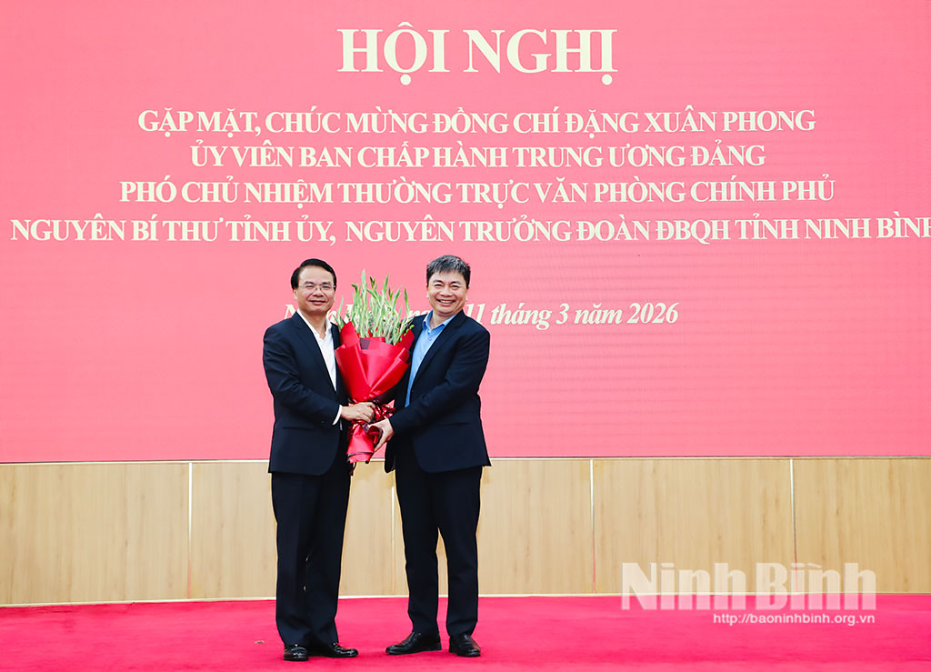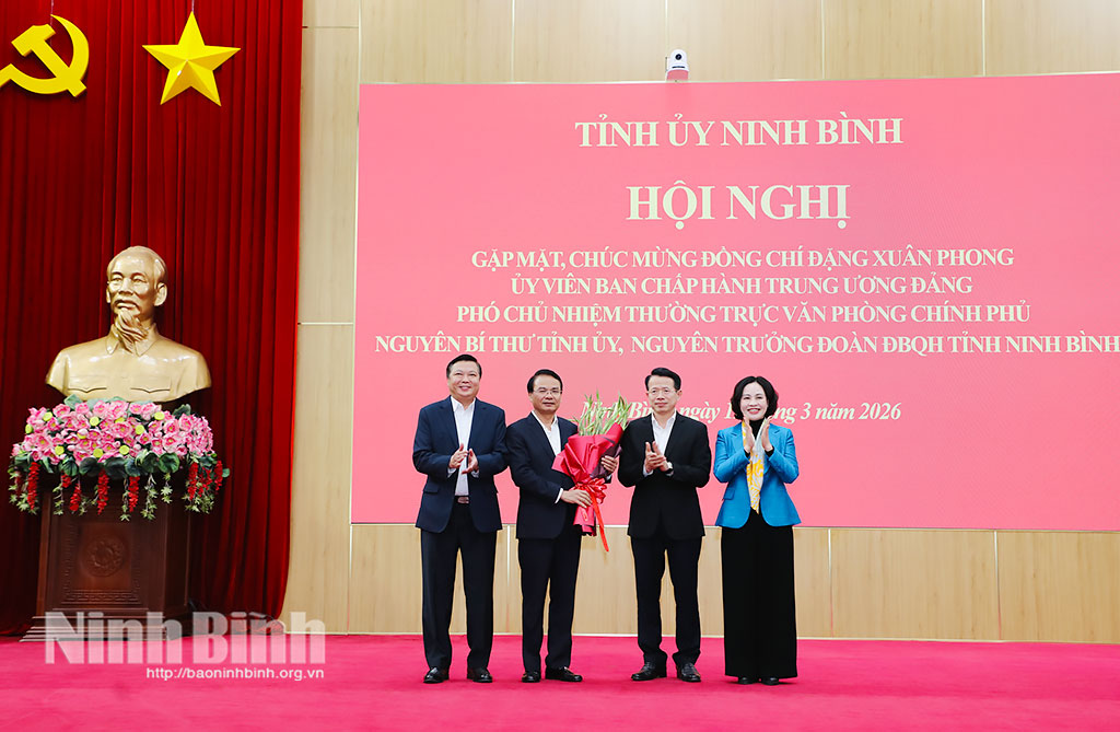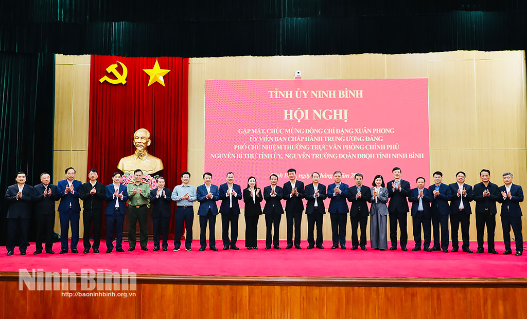 Chiều 11/3, Tỉnh ủy Ninh Bình tổ chức Hội nghị gặp mặt, chúc mừng đồng chí Đặng Xuân Phong, Ủy viên Trung ương Đảng, nguyên Bí thư Tỉnh ủy, nguyên Trưởng Đoàn đại biểu Quốc hội tỉnh được Bộ Chính trị điều động, phân công và được Thủ tướng Chính phủ bổ nhiệm giữ chức Phó Chủ nhiệm Thường trực Văn phòng Chính phủ.