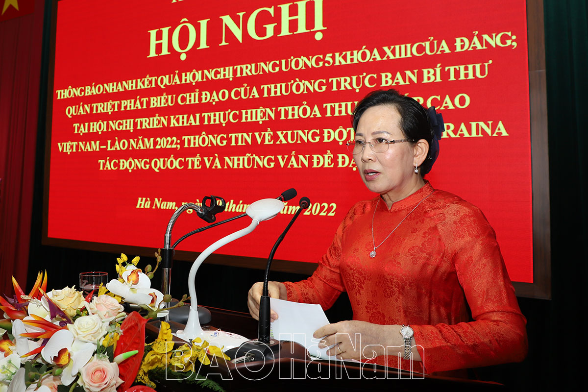 Tại hội nghị, đồng chí Lê Thị Thủy, Ủy viên Trung ương Đảng, Bí thư Tỉnh ủy, Chủ tịch HĐND tỉnh đã trực tiếp thông báo nhanh kết quả hội nghị Trung ương 5 khóa XIII. Theo đó, Hội nghị Trung ương 5 khóa XIII diễn ra từ ngày 4 đến 10/5. Tại hội nghị, nhiều nội dung quan trọng đã được đưa ra thảo luận và cho ý kiến như: Tổng kết 10 năm thực hiện Nghị quyết Hội nghị Trung ương 6 khóa XI về tiếp tục đổi mới chính sách, pháp luật về đất đai trong thời kỳ đẩy mạnh toàn diện công cuộc đổi mới; Tổng kết 15 năm thực hiện Nghị quyết Hội nghị Trung ương 7 khóa X về nông nghiệp, nông dân, nông thôn; Tổng kết 20 năm thực hiện Nghị quyết Hội nghị Trung ương 5 khóa IX về tiếp tục đổi mới, phát triển và nâng cao hiệu quả kinh tế tập thể; Đề án xây dựng tổ chức cơ sở đảng và đảng viên; Đề án thành lập Ban Chỉ đạo cấp tỉnh về phòng, chống tham nhũng, tiêu cực; Báo cáo kiểm điểm sự lãnh đạo, chỉ đạo của Bộ Chính trị, Ban Bí thư năm 2021 và một số vấn đề quan trọng khác...