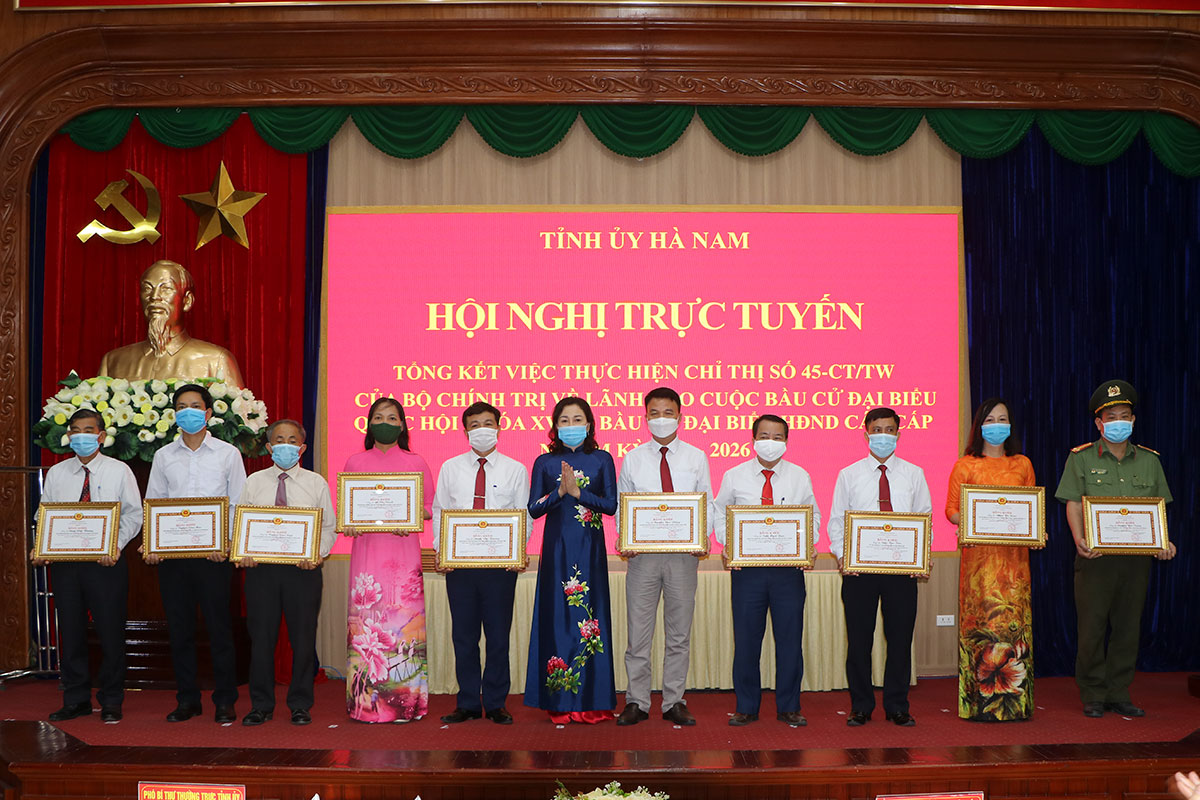 Sáng 25/6, Tỉnh ủy Hà Nam tổ chức hội nghị trực tuyến tổng kết việc thực hiện Chỉ thị 45-CT/TW, ngày 20/6/2020 của Bộ Chính trị về lãnh đạo cuộc bầu cử đại biểu Quốc hội (ĐBQH) khóa XV và bầu cử đại biểu HĐND các cấp nhiệm kỳ 2021-2026.