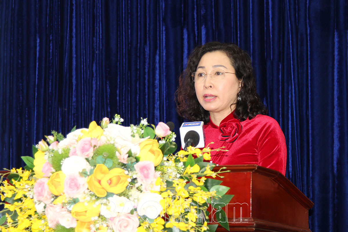Phát biểu kết luận hội nghị, đồng chí Lê Thị Thủy, Uỷ viên Trung ương Đảng, Bí thư Tỉnh ủy, Chủ tịch HĐND tỉnh biểu dương, ghi nhận thành tích của cấp ủy, chính quyền, MTTQ, các đoàn thể các cấp, doanh nghiệp và nhân dân đạt được trong năm 2021. Năm 2022 dự báo còn nhiều khó khăn, nhất là dịch bệnh Covid-19 còn diễn biến phức tạp, BCH Đảng bộ tỉnh đã thống nhất chủ đề hành động của năm đó là: “Đẩy mạnh công tác xây dựng, chỉnh đốn Đảng và hệ thống chính trị; thực hiện quyết liệt cải cách hành chính, nâng cao chất lượng, hiệu quả thực thi công vụ, phát huy vai trò, trách nhiệm của người đứng đầu các cơ quan, đơn vị; tạo chuyển biến tích cực về môi trường đầu tư kinh doanh; thích ứng an toàn, linh hoạt, kiểm soát hiệu quả dịch Covid-19; phát triển toàn diện các lĩnh vực kinh tế - xã hội, quốc phòng - an ninh” do vậy đồng chí Bí thư Tỉnh ủy đề nghị: các cấp ủy, chính quyền, MTTQ, đoàn thể các cấp, ngành, địa phương, cơ quan, đơn vị cần tiếp tục lãnh đạo, chỉ đạo quán triệt, triển khai thực hiện các chỉ thị, nghị quyết, kết luận của Trung ương; nghị quyết chuyên đề, chương trình, đề án.. của Tỉnh ủy về triển khai thực hiện Nghị quyết Đại hội XIII của Đảng, Nghị quyết Đại hội Đảng bộ tỉnh lần thứ XX.
