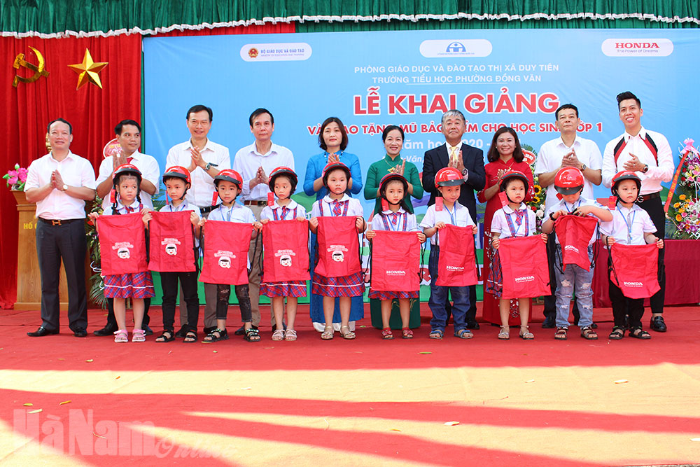 Sáng 5/9, tại Lễ khai giảng năm học mới của trường Tiểu học phường Đồng Văn (thị xã Duy Tiên), Ủy ban An toàn giao thông (ATGT) Quốc gia phối hợp với Bộ Giáo dục và Đào tạo, Công ty Honda Việt Nam tổ chức Chương trình trao tặng mũ bảo hiểm (MBH) cho học sinh lớp 1 toàn quốc năm học 2020 -2021.