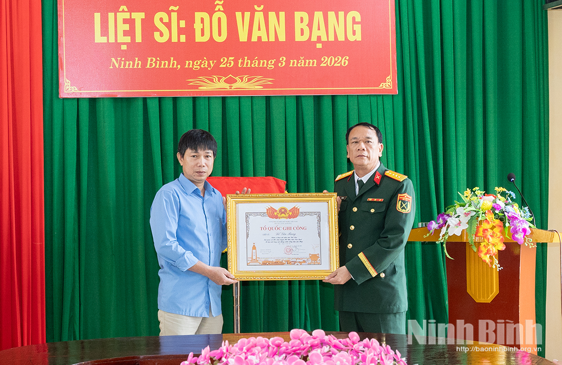Ghi nhận công lao đóng góp của đồng chí trong cuộc kháng chiến chống thực dân Pháp, ngày 12/2/2026, Thủ tướng Chính phủ ký Quyết định số 286/QĐ-TTg cấp Bằng “Tổ quốc ghi công” đối với Liệt sĩ Đỗ Văn Bạng. Tại buổi lễ, Đại tá Tô Văn Hà, Phó Chính ủy Bộ CHQS tỉnh trang trọng trao Bằng “Tổ quốc ghi công” cho đại diện gia đình liệt sĩ.