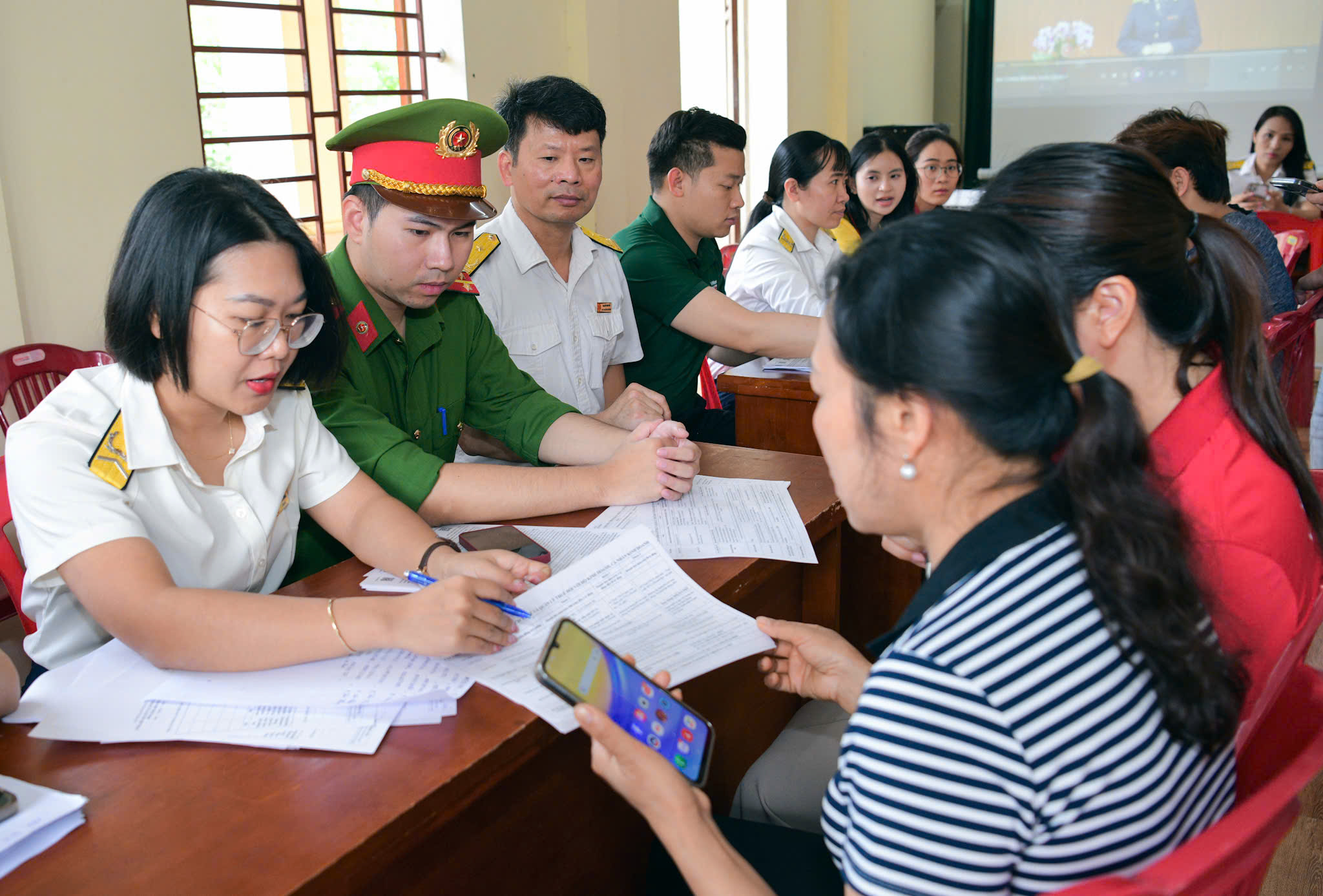 Cán bộ Phòng Cảnh sát kinh tế (Công an tỉnh) và các lực lượng tham gia hỗ trợ người nộp thuế tại Ngày hội.