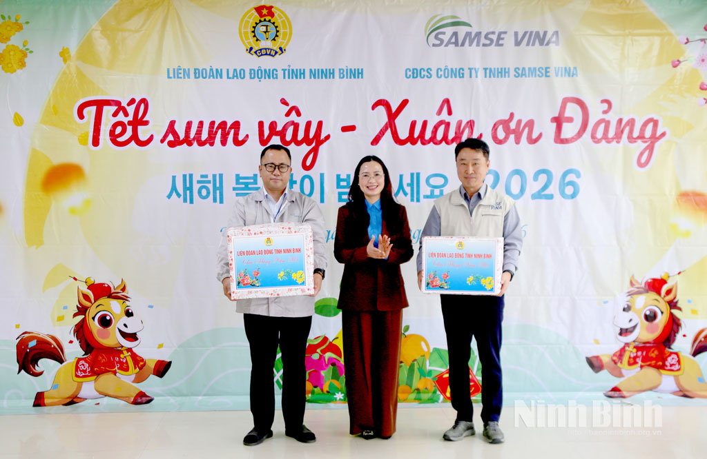 * Nhằm kịp thời động viên doanh nghiệp và công nhân lao động nhân dịp Tết Nguyên đán Bính Ngọ 2026, sáng 4/2, Liên đoàn Lao động (LĐLĐ) tỉnh phối hợp với Công đoàn phường Nam Hoa Lư tổ chức thăm, tặng quà cho đoàn viên, công nhân lao động Công ty cổ phần xi măng Hệ Dưỡng, Công ty TNHH Samse Vina và Công ty TNHH Vina Hitek, thuộc Cụm công nghiệp Cầu Yên (phường Nam Hoa Lư).