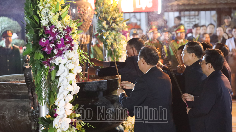 | Các đồng chí lãnh đạo Trung ương, lãnh đạo tỉnh dâng hương tưởng nhớ các vua Trần và Đức Thánh Trần - Quốc công Tiết chế Hưng Đạo Đại vương Trần Quốc Tuấn. |