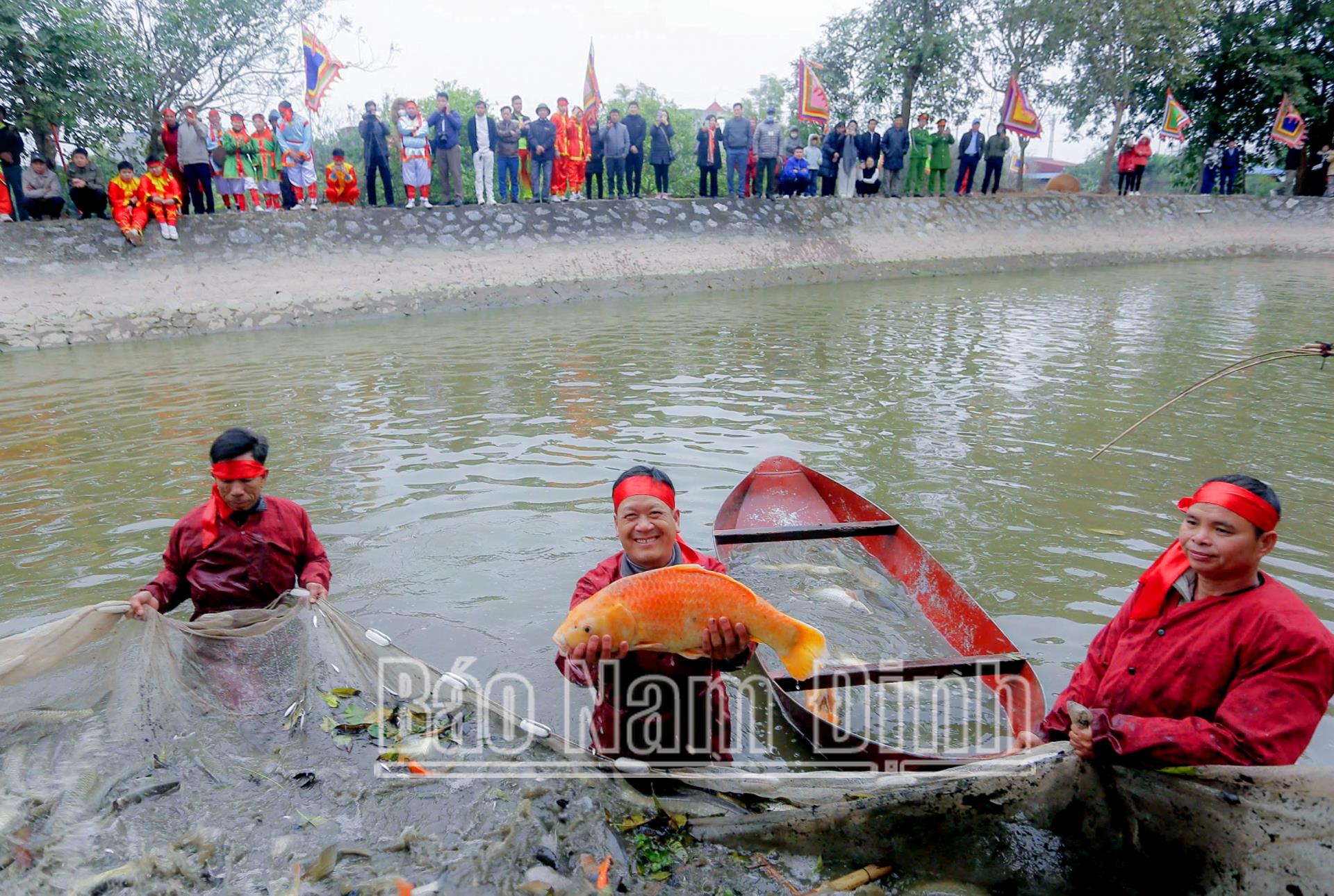 Sau khi lấy nước, đoàn lễ tổ chức đánh cá tại ao cạnh giếng Rồng, đánh bắt hai loại cá Triều đẩu (cá quả) và Long ngư (cá chép), đựng trong những chiếc thúng sơn đỏ rồi chuyển đến kiệu Rồng. Từ 8 giờ 30 phút, đoàn bắt đầu rước Nước và rước Cá về Đền Thiên Trường, thực hiện nghi lễ dâng Nước và tế Cá. Tiếp theo, cá được đưa đi phóng sinh ở sông Hồng, tại khu vực phà Hữu Bị (thuộc địa bàn xã Mỹ Trung). Nghi lễ phóng sinh cá ra sông Hồng có ngụ ý, tổ tiên nhà Trần xuất thân từ nghề chài lưới nên phải nhân nuôi đàn cá để bảo vệ nguồn lợi, khai thác lâu dài chứ không tận diệt nguồn lợi thiên nhiên ban tặng.
