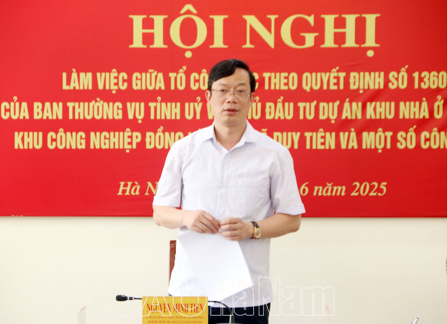 Chiều 19/6, Tổ công tác kiểm tra, giải quyết các vụ việc khiếu nại, tố cáo kéo dài, vượt cấp của Trung ương theo Quyết định số 1360 - QĐ/TU ngày 9/4/2025 của Ban Thường vụ (BTV) Tỉnh ủy làm việc với chủ đầu tư Dự án khu nhà ở phục vụ KCN Đồng Văn (phường Đồng Văn, thị xã Duy Tiên) và một số hộ dân liên quan. Đồng chí Nguyễn Minh Tiến, Ủy viên BTV Tỉnh ủy, Trưởng Ban Nội chính Tỉnh ủy, Tổ phó Thường trực Tổ công tác 1360 chủ trì hội nghị. Dự hội nghị có các thành viên Tổ công tác và UBND thị xã Duy Tiên.