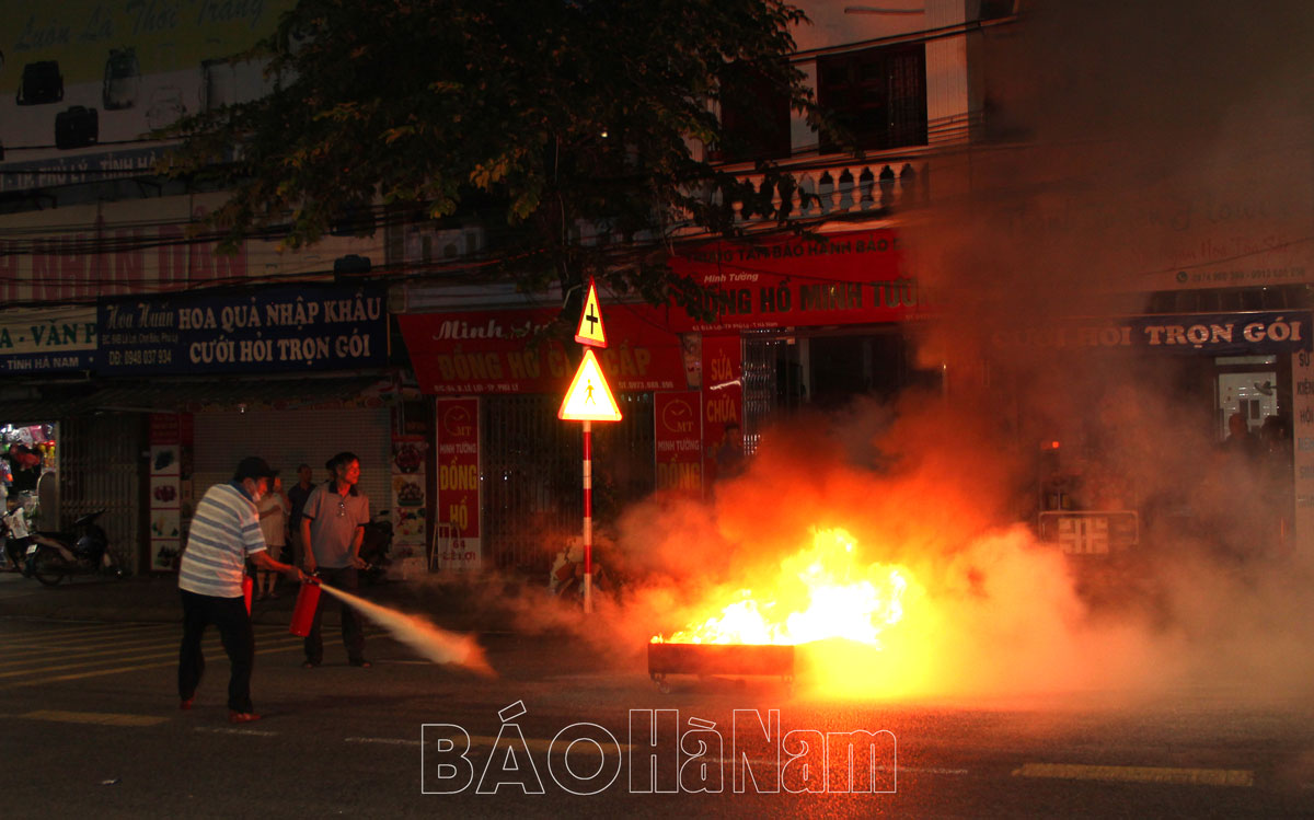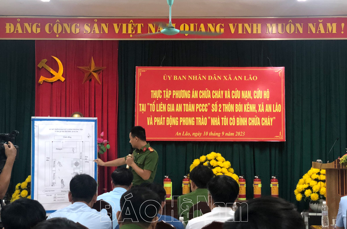 Lực lượng công an trình bày phương án thực tập tại Tổ liên gia an toàn PCCC xã An Lão, huyện Bình Lục.Các lực lượng tham gia thực tập tại Tổ liên gia an toàn PCCC thị trấn Quế, huyện Kim Bảng.Theo tình huống giả định, thành viên Tổ liên gia an toàn PCCC thị trấn Vĩnh Trụ, huyện Lý Nhân tổ chức phá khóa cứu người và tài sản.Diễn tập tổ chức cứu người và tài sản ra khỏi đám cháy.Các lực lượng phối hợp chữa cháy, cứu người, cứu tài sản tại điểm thực tập thị trấn Vĩnh Trụ, huyện Lý Nhân.Người bị thương được lực lượng chức năng và người dân sơ cứu, nhanh chóng đưa tới bệnh viện.Lãnh đạo UBND thành phố Phủ Lý trao tặng bình chữa cháy cho các hộ dân có hoàn cảnh khó khăn trên địa bàn.