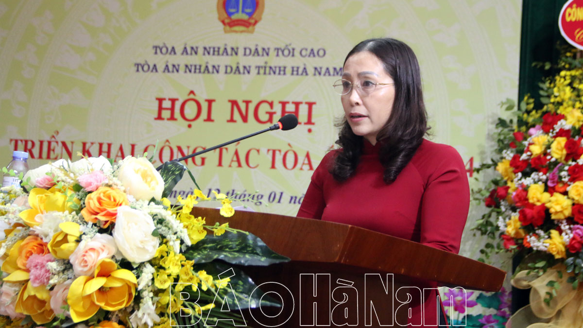 Phát biểu chỉ đạo tại hội nghị, đồng chí Đinh Thị Lụa, Phó Bí thư Thường trực Tỉnh ủy ghi nhận, biểu dương những kết quả đạt được trong năm 2023 của TAND 2 cấp trong tỉnh. Về nhiệm vụ năm 2024, đồng chí Phó Bí thư Thường trực Tỉnh ủy đề nghị TAND 2 cấp tỉnh Hà Nam tiếp tục tuyên truyền, quán triệt, triển khai thực hiện tốt các nghị quyết, chỉ thị, kết luận và văn bản lãnh đạo, chỉ đạo của Trung ương, của tỉnh. Nâng cao chất lượng xét xử, chú trọng hoạt động tranh tụng tại phiên tòa theo tinh thần CCTP; hạn chế mức thấp nhất án bị hủy, sửa; nâng cao chất lượng, tính chính xác, tính khả thi, các phán quyết của tòa án, nhất là việc áp dụng các hình phạt, không để xảy ra oan sai, bỏ lọt tội phạm; đưa ra xét xử kịp thời, nghiêm minh các vụ án thuộc diện BCĐ tỉnh về PCTN, TC theo dõi, chỉ đạo.