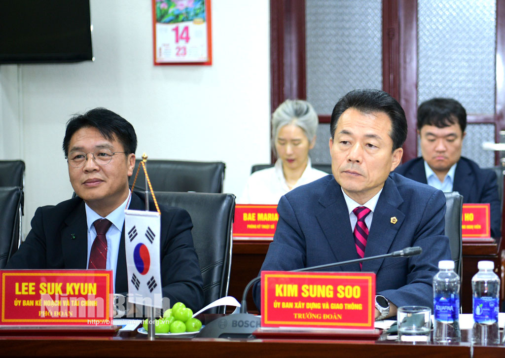 Đồng chí Đặng Thanh Sơn, Ủy viên Ban Thường vụ Tỉnh ủy, Phó Chủ tịch Thường trực HĐND tỉnh và ngài Kim Sung Soo, Ủy viên Ủy ban Xây dựng và Giao thông Hội đồng tỉnh Gyeonggi đồng chủ trì buổi làm việc.