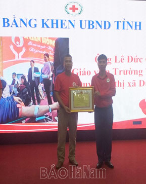 Thầy giáo Đỗ Văn Phong nhận Bằng khen của Chủ tịch UBND tỉnh vì có những thành tích xuất sắc trong công tác hiến máu nhân đạo tại địa phương.