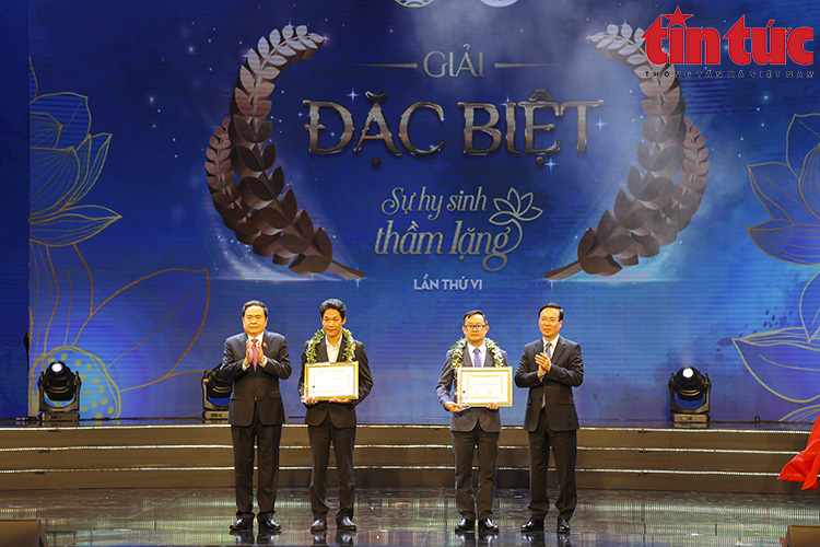 Tôn vinh Thầy thuốc Việt Nam và trao giải cuộc thi viết 'Sự hy sinh thầm lặng' lần VI- Ảnh 2. Đồng chí Võ Văn Thưởng, Ủy viên Bộ Chính trị, Chủ tịch nước CHXHCN Việt Nam; Đồng chí Trần Thanh Mẫn, Ủy viên Bộ Chính trị, Phó Chủ tịch Thường trực Quốc hội nước CHXHCN Việt Nam trao giải Đặc biệt cho tác giả Ngô Anh Văn và trao chứng nhận cho nhân vật trong tác phẩm đoạt giải - Bác sĩ Võ Thái Trung.