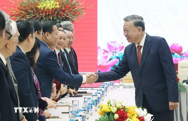 Thay mặt lãnh đạo Đảng, Nhà nước, Tổng Bí thư Tô Lâm ghi nhận, biểu dương, đánh giá cao và chúc mừng những thành tựu, kết quả mà đội ngũ trí thức, nhà khoa học nước ta đã đạt được trong các giai đoạn cách mạng của Đảng, đặc biệt trong giai đoạn đổi mới đất nước.