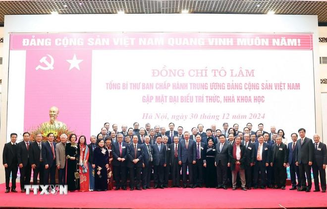 | Tổng Bí thư Tô Lâm và các đại biểu tri thức, nhà khoa học. (Ảnh: Thống Nhất/TTXVN) |
