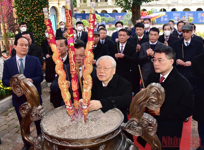 Trong không khí phấn khởi của những ngày đầu Xuân mới, Tổng Bí thư Nguyễn Phú Trọng cùng các đại biểu đã thành kính dâng hương tưởng nhớ; cẩn cáo trước anh linh các vị tiên đế, hiền tài có công với nước về những kết quả nổi bật của đất nước, Thủ đô trong năm Tân Sửu 2021.