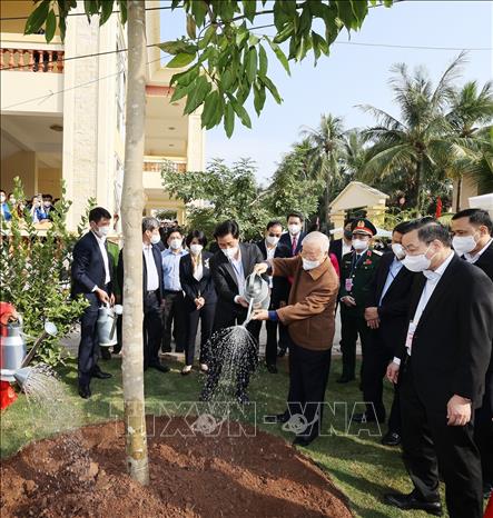 Trước đó, Tổng Bí thư Nguyễn Phú Trọng và các đại biểu đã vào dâng hương tại chùa Pháp Vũ và trồng cây lưu niệm trong khuôn viên Nhà văn hóa xã Yên Sở.