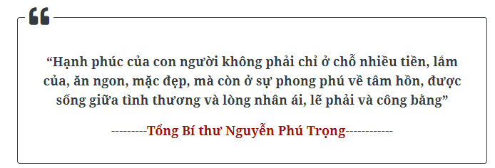 “Chúng ta cần một xã hội mà trong đó sự phát triển là thực sự vì con người, chứ không phải vì lợi nhuận mà bóc lột và chà đạp lên phẩm giá con người. Chúng ta cần sự phát triển về kinh tế đi đôi với tiến bộ và công bằng xã hội, chứ không phải gia tăng khoảng cách giàu nghèo và bất bình đẳng xã hội”, Tổng Bí thư Nguyễn Phú Trọng nêu trong bài viết "Một số vấn đề lý luận và thực tiễn về chủ nghĩa xã hội và con đường đi lên chủ nghĩa xã hội ở Việt Nam”.