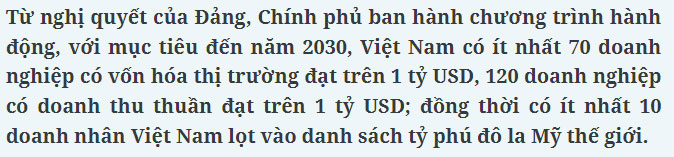 Từ nghị quyết của Đảng, Chính phủ ban hành chương trình hành động, với mục tiêu đến năm 2030, Việt Nam có ít nhất 70 doanh nghiệp có vốn hóa thị trường đạt trên 1 tỷ USD, 120 doanh nghiệp có doanh thu thuần đạt trên 1 tỷ USD; đồng thời có ít nhất 10 doanh nhân Việt Nam lọt vào danh sách tỷ phú đô la Mỹ thế giới, 5 doanh nhân quyền lực nhất châu Á do các tổ chức uy tín thế giới bình chọn.