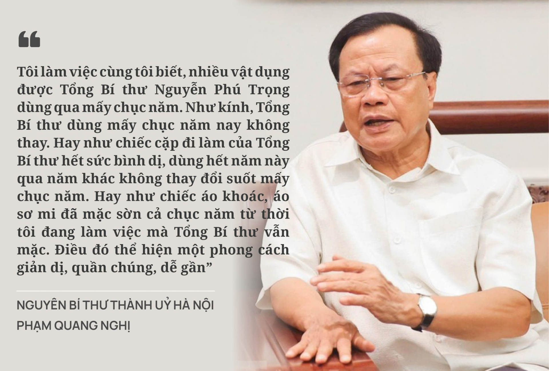 “Tôi làm việc cùng tôi biết, nhiều vật dụng được Tổng Bí thư Nguyễn Phú Trọng dùng qua mấy chục năm. Như kính, Tổng Bí thư dùng mấy chục năm nay không thay. Hay như chiếc cặp đi làm của Tổng Bí thư hết sức bình dị, dùng hết năm này qua năm khác không thay đổi suốt mấy chục năm. Hay như chiếc áo khoác, áo sơ mi đã mặc sờn cả chục năm từ thời tôi đang làm việc mà Tổng Bí thư vẫn mặc. Điều đó thể hiện một phong cách giản dị, quần chúng, dễ gần”, ông Nghị nói.