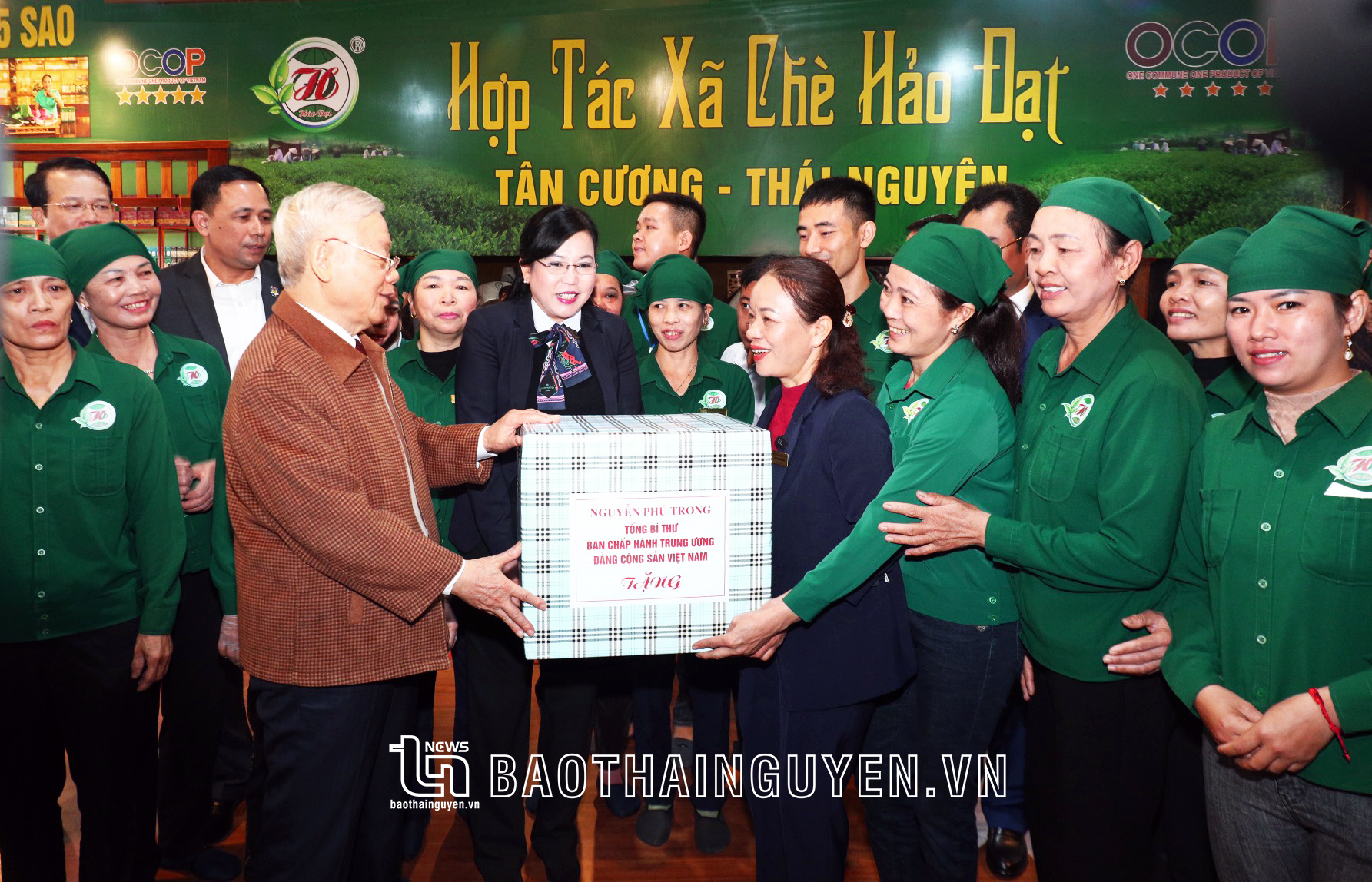 Tham quan quy trình sản xuất chè đặc sản của HTX, Tổng Bí thư Nguyễn Phú Trọng ân cần hỏi thăm đời sống, thu nhập của các thành viên, người lao động. Nhân dịp này, Tổng Bí thư đã tặng quà và chúc các thành viên, người lao động của HTX chè Hảo Đạt đón Tết an vui, đầm ấm...