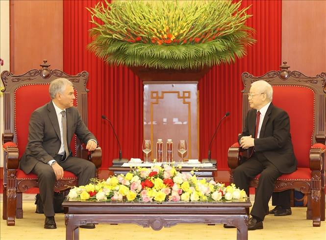 Chủ tịch Duma Quốc gia Quốc hội Liên bang Nga bày tỏ vui mừng được thăm lại Việt Nam và gặp lại Tổng Bí thư Nguyễn Phú Trọng, đồng thời trân trọng chuyển lời chào thân thiết của Tổng thống Nga V. Putin và các lãnh đạo cấp cao của Liên bang Nga tới Tổng Bí thư Nguyễn Phú Trọng. Chủ tịch Vyacheslav Vichtorovich Volodin khẳng định, dù có nhiều đảng theo các khuynh hướng chính trị khác nhau nhưng Duma Quốc gia Nga luôn ủng hộ thúc đẩy quan hệ Đối tác chiến lược toàn diện với Việt Nam. Liên bang Nga luôn coi Việt Nam là đối tác ưu tiên, quan trọng trong chính sách đối ngoại của mình tại khu vực châu Á - Thái Bình Dương.