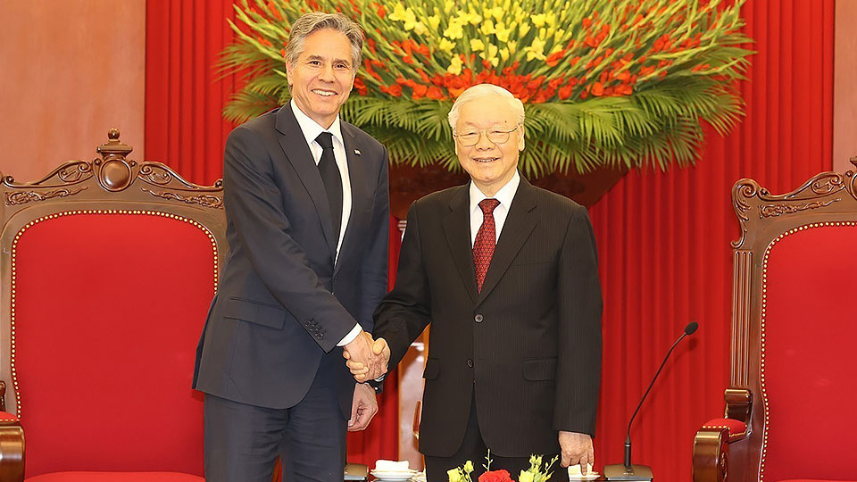 Tổng Bí thư Nguyễn Phú Trọng hoan nghênh Ngoại trưởng Antony Blinken lần đầu tiên thăm chính thức Việt Nam trên cương vị Ngoại trưởng Hoa Kỳ, cho rằng chuyến thăm có ý nghĩa khi diễn ra vào dịp kỷ niệm 10 năm thiết lập quan hệ Đối tác Toàn diện Việt Nam - Hoa Kỳ. Tổng Bí thư hoan nghênh kết quả các cuộc làm việc của Ngoại trưởng Hoa Kỳ tại Việt Nam, đánh giá cao sự phát triển mạnh mẽ, toàn diện của quan hệ hai nước, khẳng định những cơ sở quan trọng cho sự phát triển của quan hệ song phương là tôn trọng độc lập, chủ quyền, toàn vẹn lãnh thổ và thể chế chính trị của nhau, vì hòa bình, ổn định, phát triển ở khu vực và thế giới.