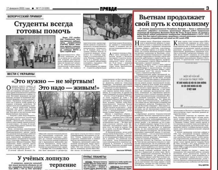 | Bài viết “Việt Nam tiếp tục con đường đi lên chủ nghĩa xã hội” của tác giả Piotr Tsvetov trên Báo Sự thật của Đảng Cộng sản LB Nga số ra ngày 17/2/2022. |